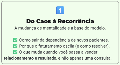 Você aprende como fidelizar pacientes, aumentar o faturamento e construir estabilidade no seu negócio.