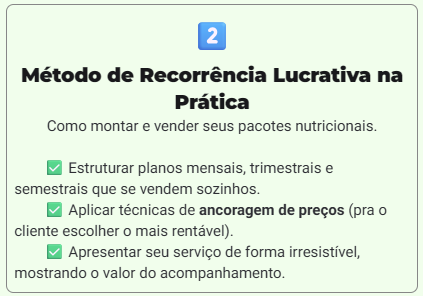 É um passo a passo simples que ensina nutricionistas a criar pacotes de acompanhamento e transformar atendimentos avulsos em receita mensal previsível.